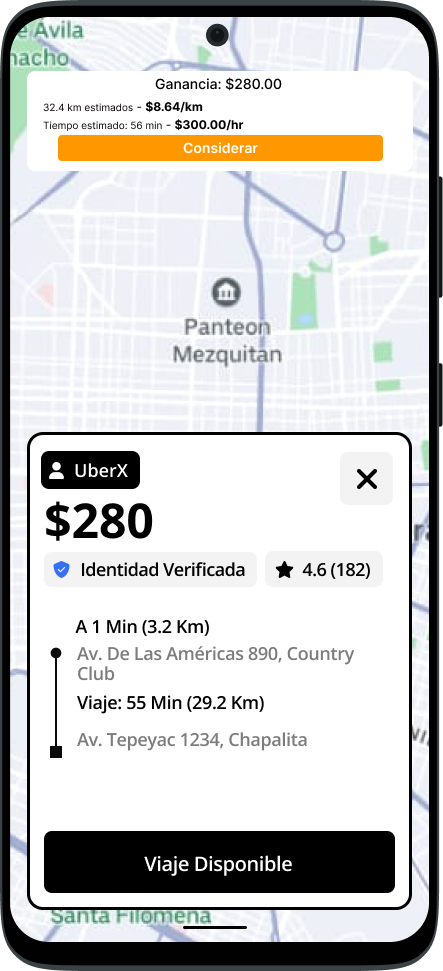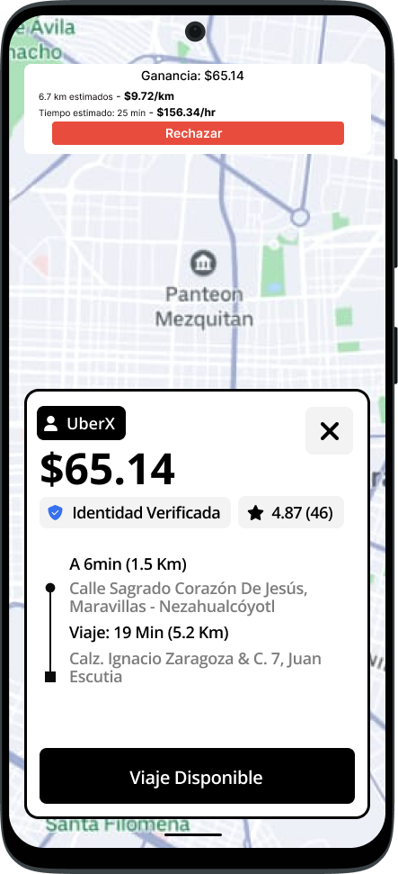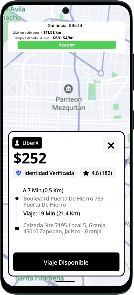 UDDI es una capa visual que complementa tu app de conductor. Se superpone a la oferta de viaje, lee los datos en pantalla y aplica tus reglas personalizadas. El resultado es una sugerencia simple para que tomes la mejor decisión en el menor tiempo posible. El control siempre es tuyo.